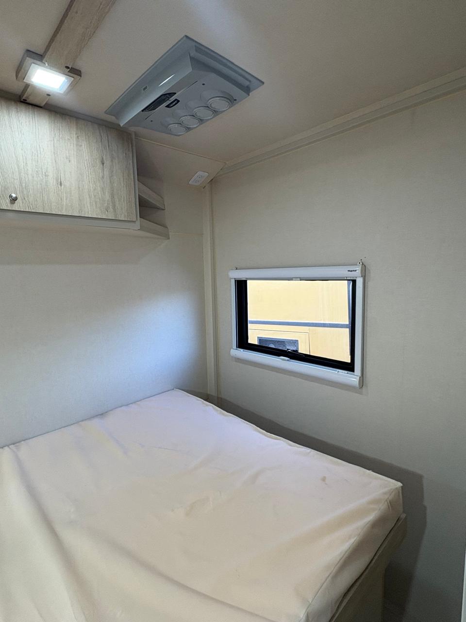 Cama matrimonial, muebles amplios, iluminación LED sectorizada y piso de madera laminada de alta resistencia.