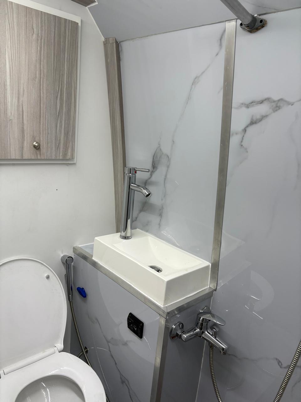Baños equipados con ducha, inodoro eléctrico y agua caliente.